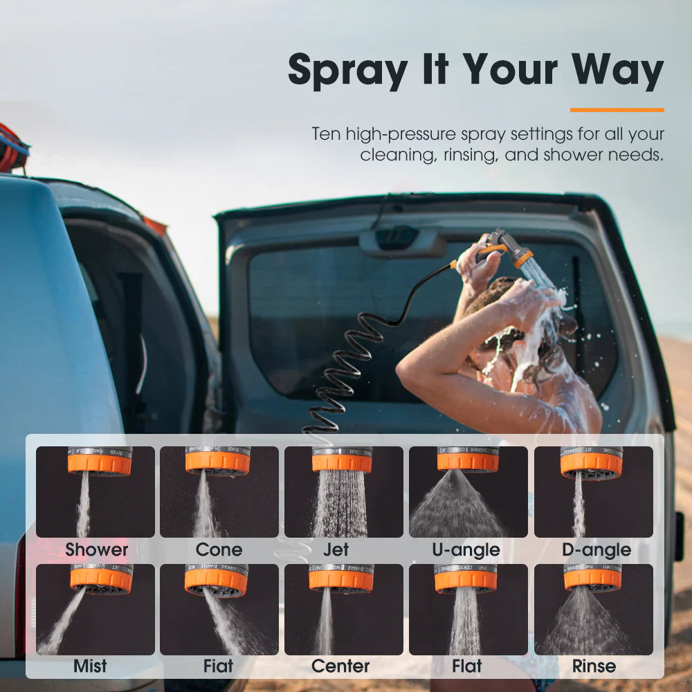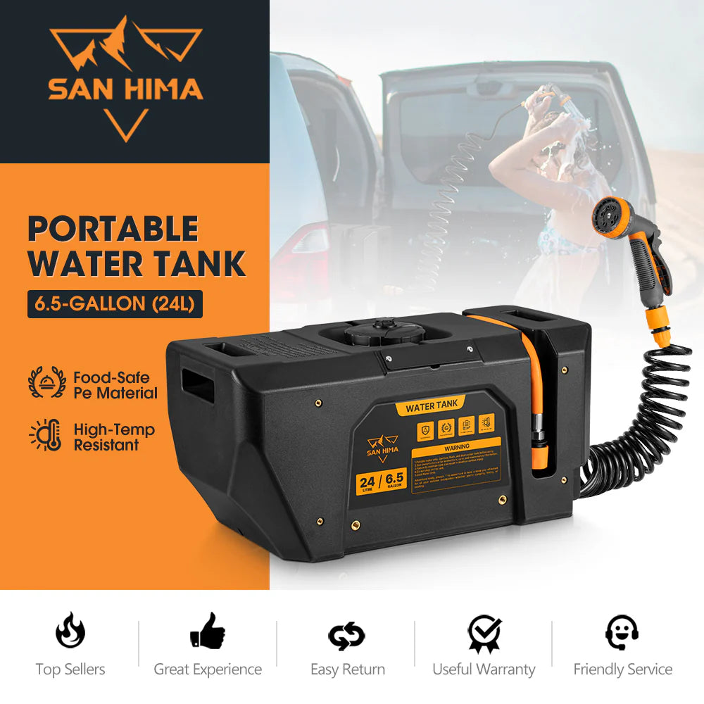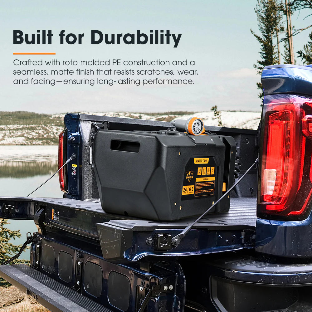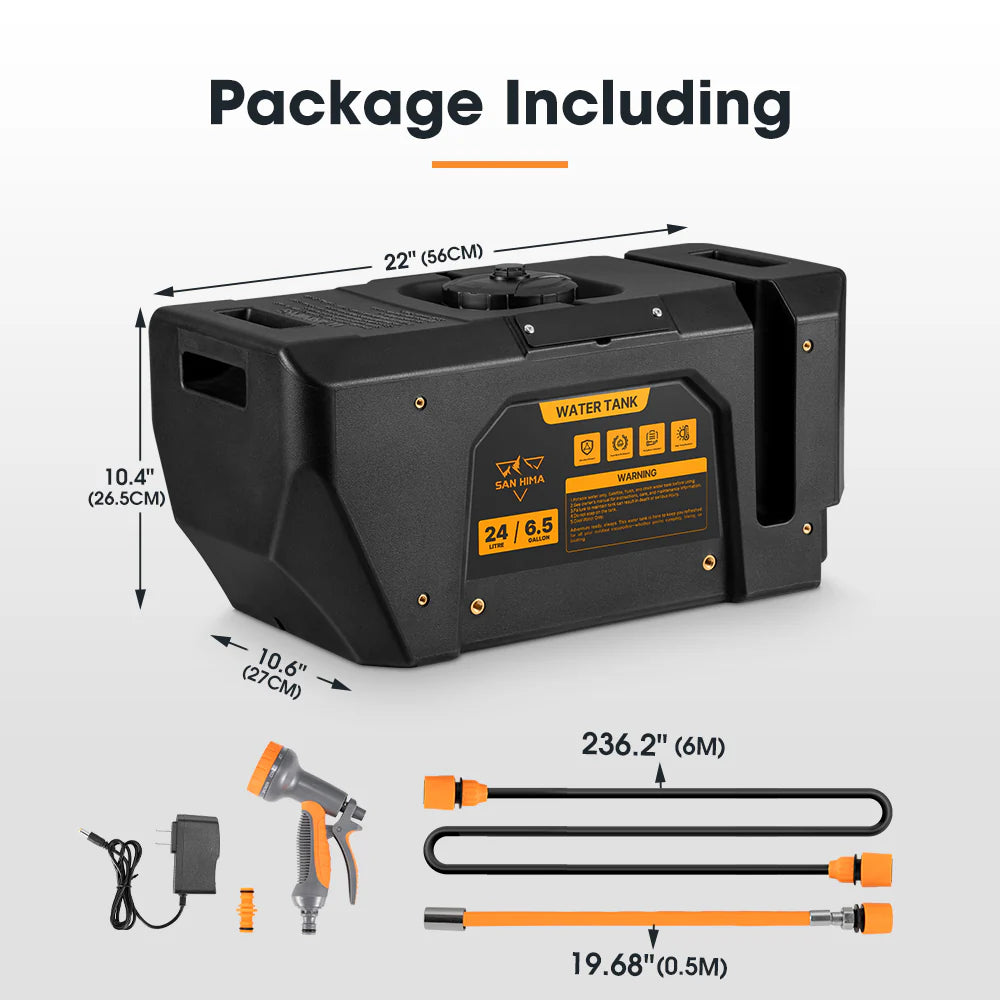 Need a quick shower after a long hike? Done. Rinsing muddy boots or sandy gear? Easy. The San Hima 6.5gal portable water tank has your covered. Equipped with a battery-powered pressurized system, it ensures you stay fresh and ready to dive back into your adventure in no time. Constructed from BPA-free, food-grade polyethylene, this water tank ensures safe hydration for drinking, cooking, or cleaning. Say goodbye to manual pumps—our battery-powered system delivers stable pressurization with the push of a button. The 20ft coiled hose and ten adjustable spray settings are perfect for cleaning tasks or enjoying a refreshing camping shower. Fully charged in just 4 hours, the tank powers up to four uses, making it ideal for extended trips. Built tough with a seamless matte finish, ergonomic handles, and off-road-ready mounting, this compact water tank offers universal fitment, making it the perfect companion for any adventure.
