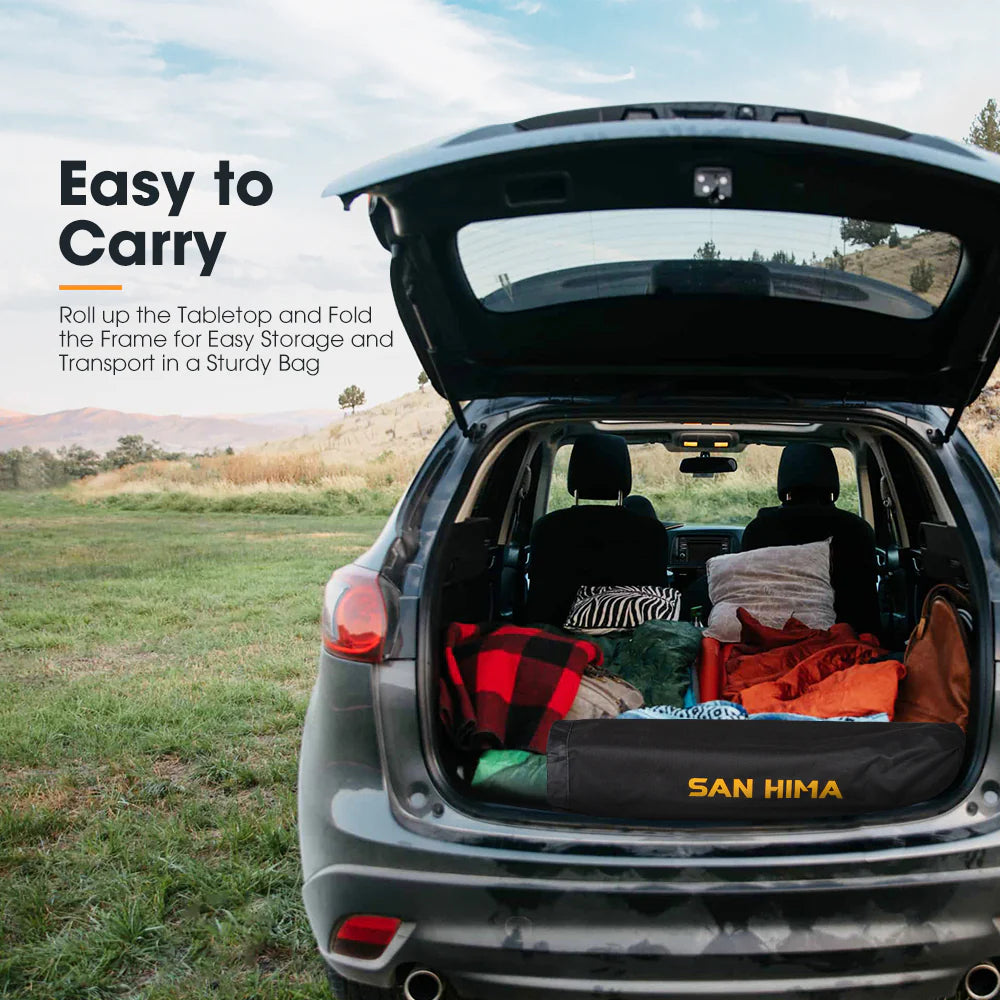 Sturdy, stable and portable table space is essential for camping adventures - whether it's for meal prep, dining with loved ones amidst stunning views, or post-dinner drinks and games. The San Hima aluminium camping table provides the perfect solution. Our camping table sets up in just 1 minute, perfect for camping, tailgating, or backyard gatherings. With dimensions of 117.4 cm x 65 cm, there's ample space to cook, dine, or organize your gear while unwinding at your favorite campsite or worksite. Featuring telescoping steel legs, adjustable from 56.8 cm to 82 cm to accommodate uneven surfaces, our folding table ensures stability during your next outdoor escapade. The powder-coated aluminum tabletop and the steel legs provide sturdy support of up to 50 kg with ease. Additionally, the under-table mesh basket adds extra storage and can be easily detached from the four legs when not in use. Complete with a durable storage bag, this table is ready to go wherever your adventures take you.