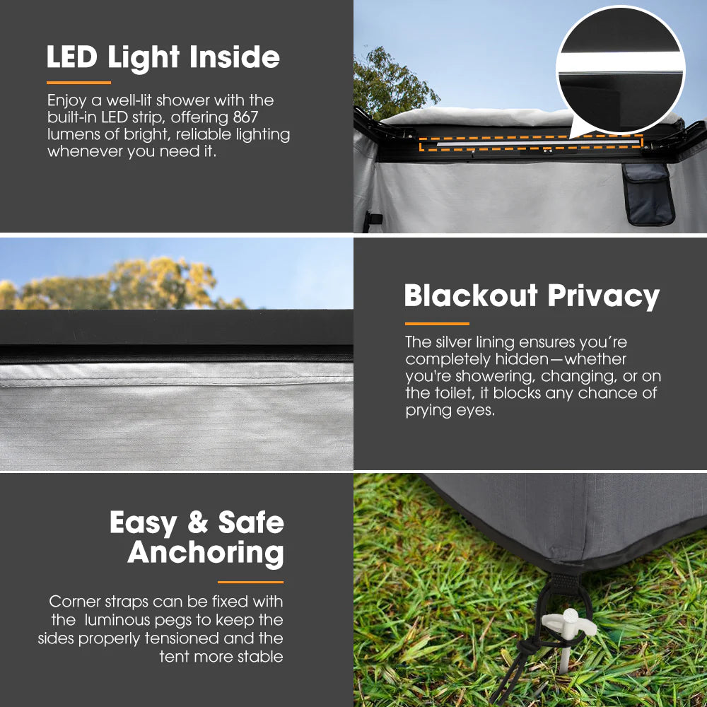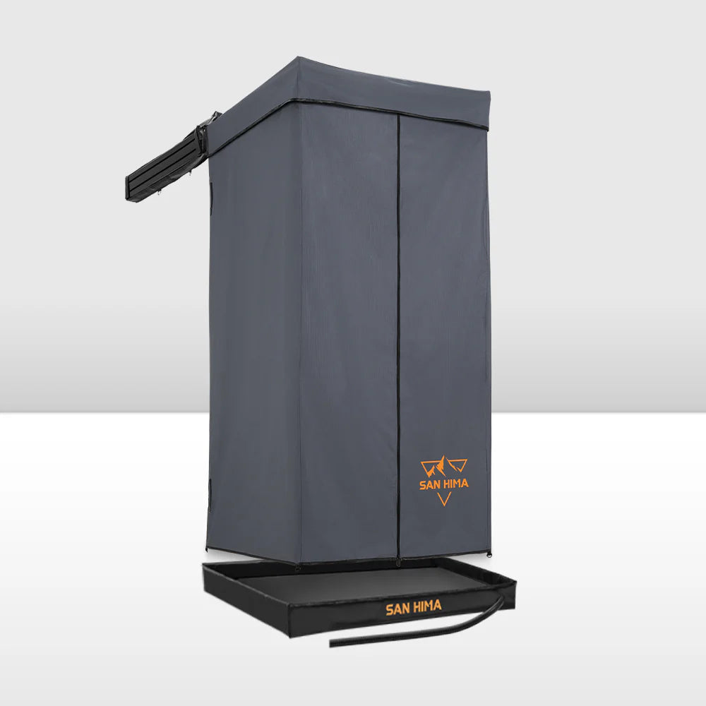 Outdoors, every little detail counts. Traditional shower awnings often do just that—making it harder to access what you need when you need it. That’s where the San Hima shower awning with its 90° swing arm comes in—it gives you an unblocked path, everything’s right where you need it. First off, the swing arm lets you access your gear without having to awkwardly maneuver around the setup, especially when you’ve got a bunch of stuff. The roof rolls back for fresh air, but when privacy’s a priority—whether you’re showering, changing, or using the toilet—the roof can be rolled up for full coverage. Made with 420D Oxford fabric and 280GT polyester-cotton, this shower tent is water-resistant (5,000mm) and offers UPF 50+ protection. The silver lining blocks any silhouettes, while the built-in LED light makes sure you’re never in the dark. With pockets for towels, clothes, and shower zippers with Velcro, everything’s within arm’s reach, making showering hassle-free.